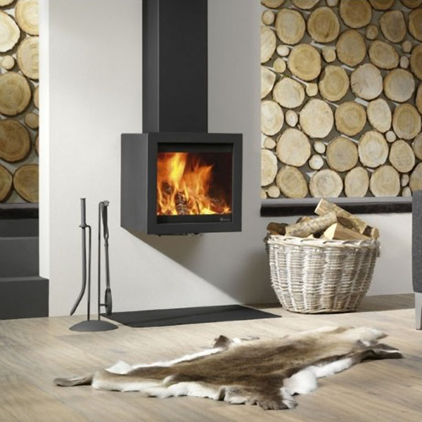 Hangende kachel met fraaie kap die de afvoerpijp netjes weg werkt. Goed regelbaar. Hoog rendement. Zeer geschikt voor hogere woonruimtes (haard kan geplaatst worden tot een maximale hoogte van 320 cm). Met infrarood glas om de warmte in de haard te circuleren.