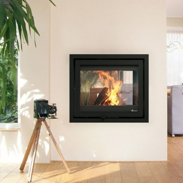Kachel geschikt voor plaatsing tussen twee ruimtes. Met aan twee zijden een draaideur met glas. Uitermate geschikt is voor de wat grotere ruimtes. Voorzien van infrarood glas om de warmte in de haard te circuleren. Met boven aansluiting.