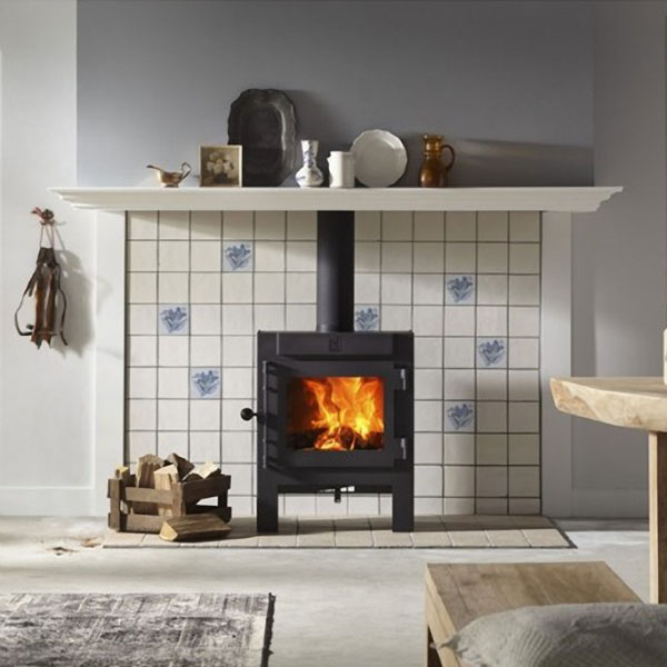 Kachel met bijzondere vormgeving, klein van formaat en zeer geschikt voor plaatsing onder een bestaande schouw. Met handige deurhendel. Voorzien van infrarood glas om de warmte in de haard te circuleren. Met boven- en achteraansluiting.