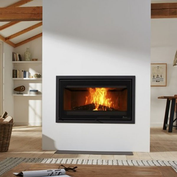 Inzethaard welke speciaal ontworpen is voor inbouw binnen een bestaande situatie. Voorzien van gescreend glas(zwart bedrukte rand). Met infrarood glas om de warmte in de haard te circuleren en boven aansluiting.