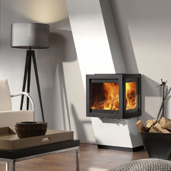 Bijzondere kachel met fraaie schuine mantel (in linkse of rechtse uitvoering). Met aan 2 zijden een glasraam voor nog meer zicht op het vuur. Vrijhangend met vaste pijp, draaibaar en voorzien van infrarood glas om de warmte in de haard te circuleren en buitenluchtaansluiting.