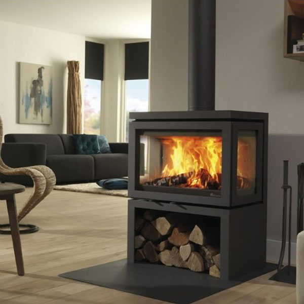 Driezijdige houtkachel met optimaal zicht op het houtvuur vanuit verschillende posities. Rendement van maar liefst 88%! Voorzien van infrarood glas om de warmte in de haard te circuleren. Met bovenaansluiting en houtvak.