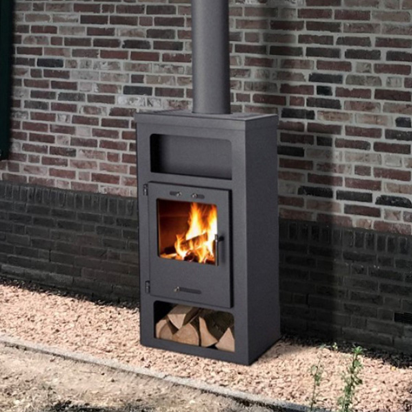 Moderne houtkachel voor buiten met grote verbrandingskamer.