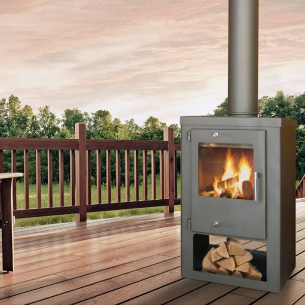 Dubbelwandige houtkachel voor in de tuin met grote verbrandingskamer.