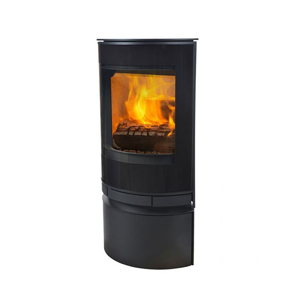Kachel met uniek ovaal ontwerp en het breedste panoramische glas op de markt (180 graden zicht op het vuur). Geïntegreerde handgreep.