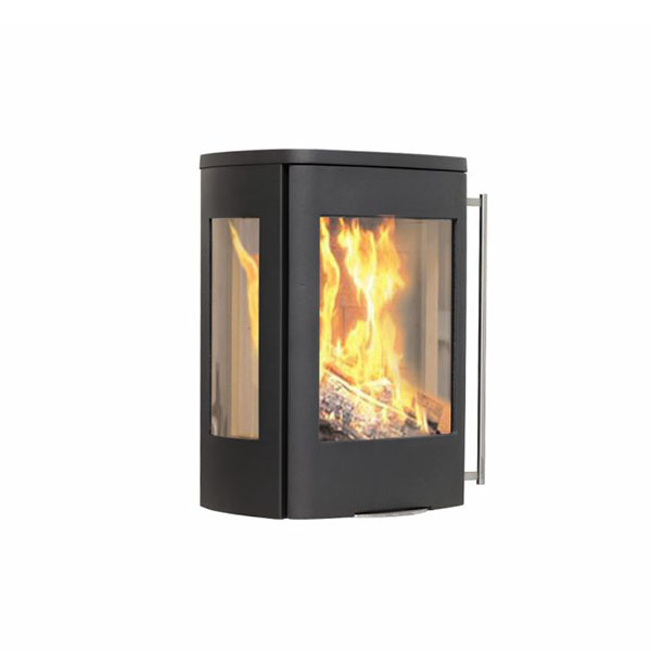 Stijlvolle kachel met zijruiten, geschikt voor huisjes met een lage warmtebehoefte (zomerhuisjes, kleine kamers of huizen met laag energieverbruik). Boven- en voorkant zijn massief gietijzer. Deur sluit vanzelf door magneten in de kachel.